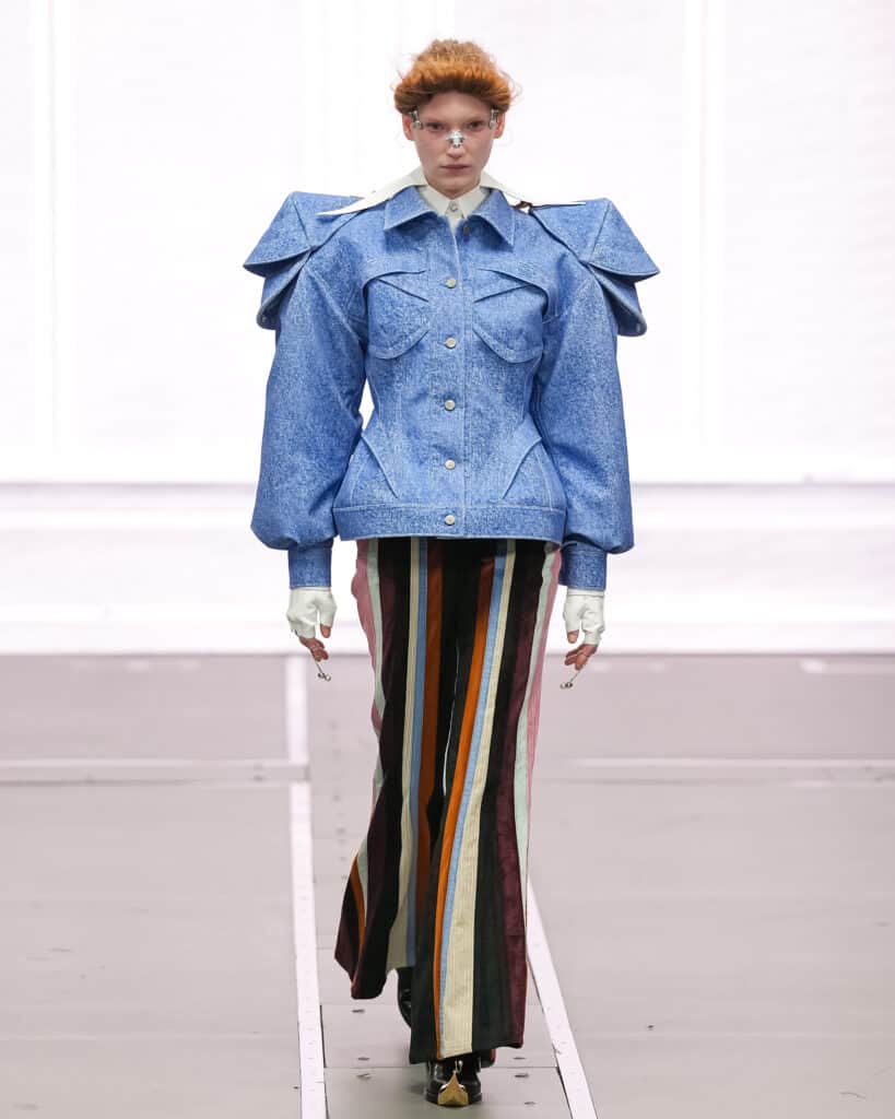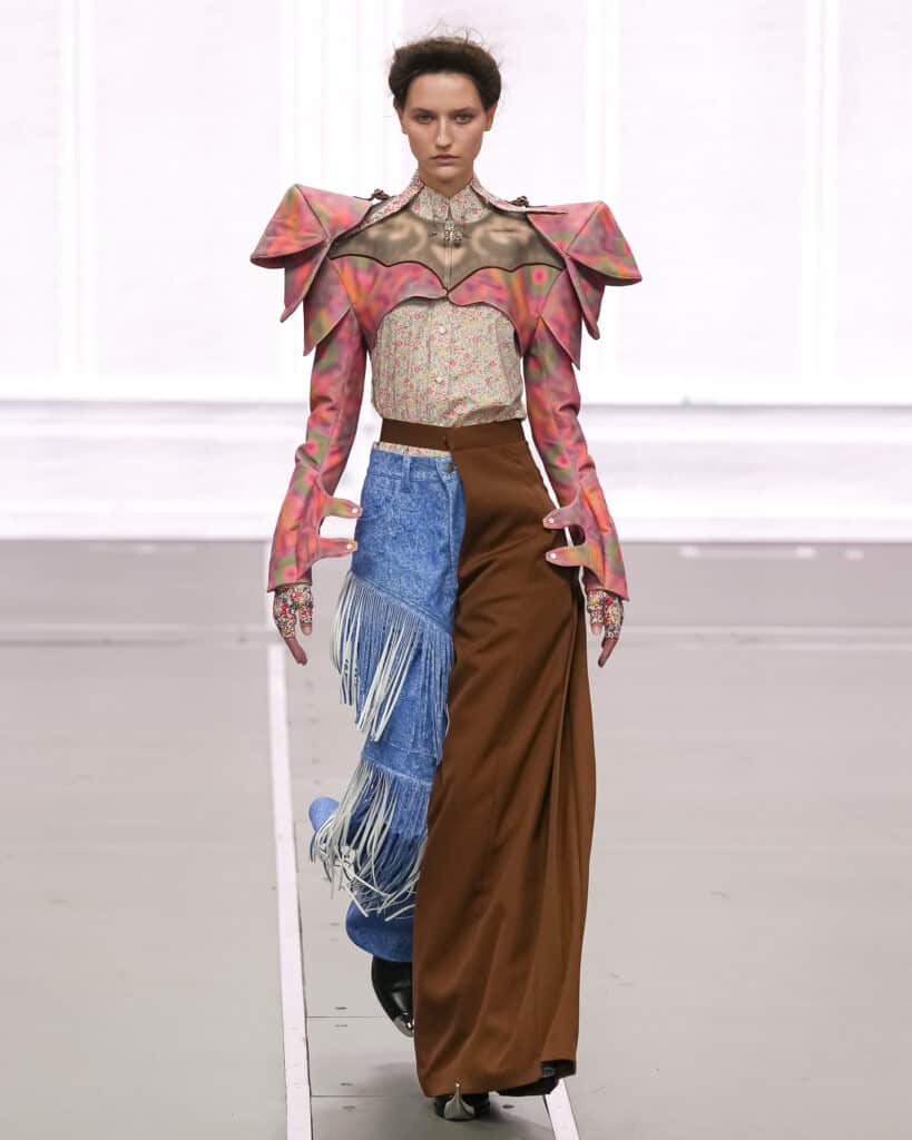 At the same time, references to 1970s fashion appear throughout. Flared fringed trousers, floral prairie shirts, and striped trousers introduce a playful, human touch. These elements soften the technological edge and bring warmth into the collection.