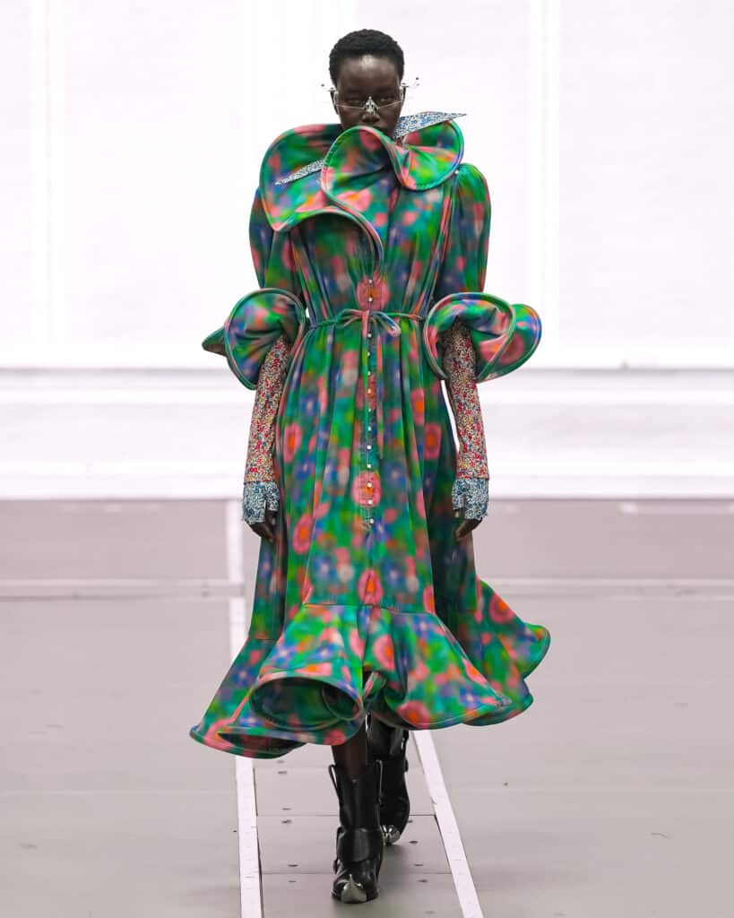 Kaleidoscopic florals shift into exaggerated, cartoon-like wired ruffles, while anime-inspired details reflect Ghost in the Shell. This contrast allows the collection to move between past and future with ease, reworking the spirit of the Seventies through a technological lens. Notably, ANREALAGE FW26 embraces this dynamic energy while paying respect to tradition and innovation.