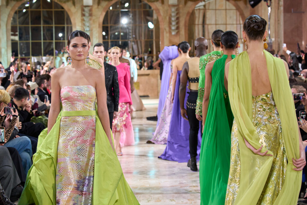 Inspired by the ethereal phenomenon known as Aurora Borealis, the collection takes its reference from a natural light display that appears in the night sky near the Earth’s polar regions. Since it is known for its movement and fleeting beauty, Robert Abi Nader explores light as something alive, constantly shifting and never fixed. Meanwhile, fabrics appear to flow, reflect, and dissolve as models move across the runway. Visually, the collection unfolds through a rich spectrum of green, moving from deep forest tones to soft pistachio shades.Meanwhile, mauve and lilac introduce contrast, while gold and silver highlights reflect light across the clothing. Together these colours shape the runway atmosphere, creating a sense of depth and movement. Moreover, the palette enhances the collection’s light driven concept. As a result, each look glows subtly as it moves. This effect reinforces the immersive and dreamlike mood of the show.