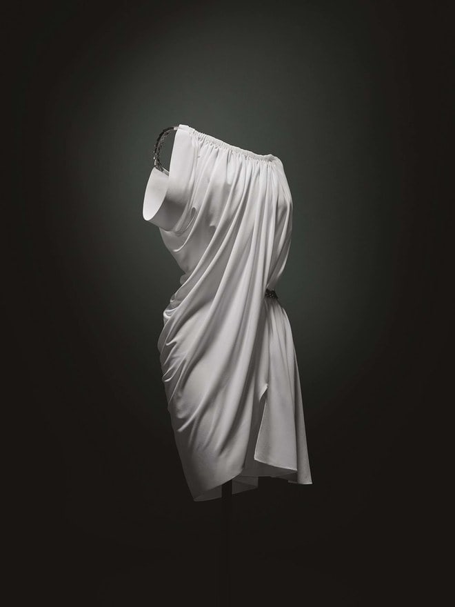 Consequently, what is inspiring is how the Alaia has draped and formed the fabric. Therefore, leading to personalizing the silhouette of a woman’s body. Finally, moving between the dresses the viewer is reminded who wore each of the masterpieces. The invisible body forms allow you to imagine Grace Jones standing in front of you. In a striking black dress with a hood created in 1986. Azzedine Alaia’s influence is evident in every piece.