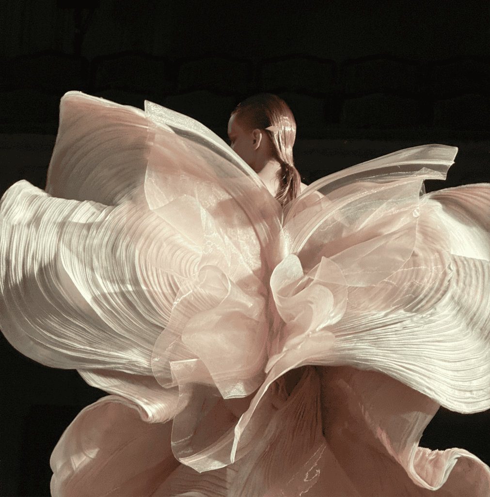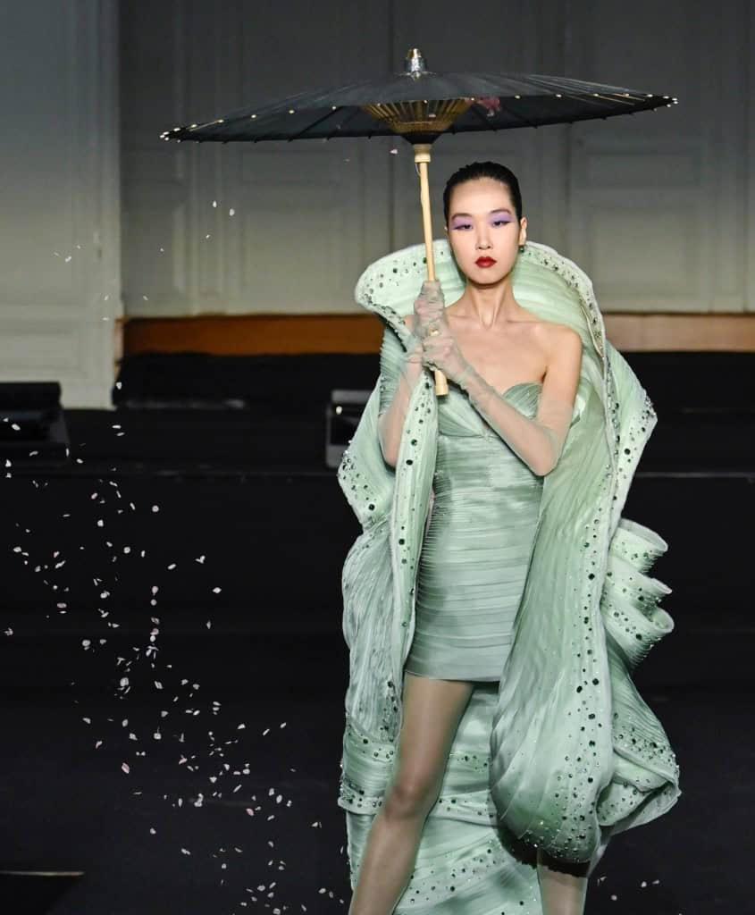 Using a technique true to his DNA. Cheney Chan emphasizes movements and shapes with his delicate layering of different textiles into voluptuous shapes. These shapes surround the models like flower petals or butterfly wings. This intricate crafting of different fabrics continues a recurrent pattern or trademark, already observed in his previous works. Not to omit the inspiration behind this technique. The designer draws from the texture you may find on traditional Chinese pottery, which is a subtle homage to his heritage. We can also note some pieces incrusted with diamonds, becoming a repeated signature look of the designer.