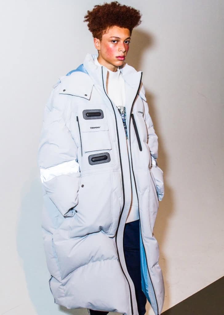 Chen Peng founded his company in 2015 in London and Shanghai. He is a graduate of the Masters in Menswear Fashion Design Technology. He defines his work as one size fashion, speaking for a wide range of bodies. Fall 2019 was his sixth collection with a shift toward technical upgrade.