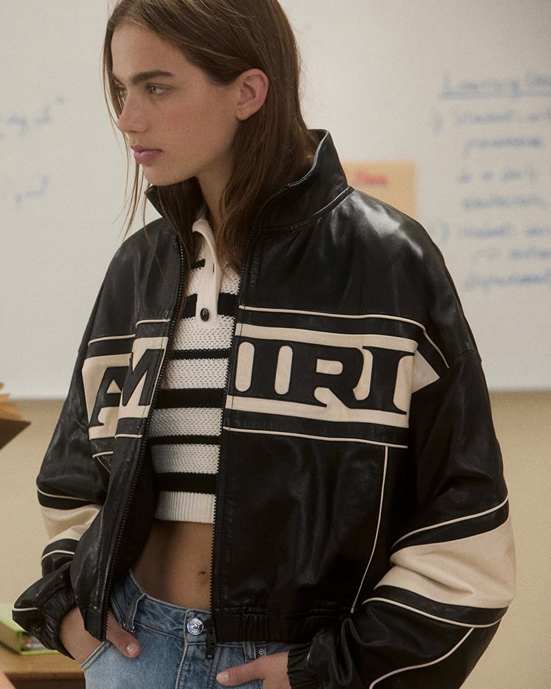 The clothing underscores individuality through mix-and-match composition. Pre-worn leather bombers, faux-fur jackets, and layered pieces build an atmosphere of lived-in California ease. Collegiate or Clubhouse style references—embroidered letterman jackets, patched denim appear alongside sporty knits. AMIRI sneakers, bags, and the monogram highlight a racer like and fast times crest, completing a visual narrative. The result is a study in self-definition through hybrid styling.