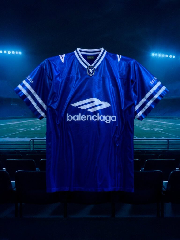 Balenciaga’s new fall 2025 series engages directly with American football, translating the sport’s visual codes into ready-to-wear. Exaggerated proportions, padded forms and performance-leaning graphics mark a first for the brand. The approach aligns with Balenciaga’s ongoing use of athletic archetypes. Vivid V-neck jerseys, varsity hoodies in sheep leather or fleece and techno-poplin tracksuits reinterpret familiar sports shapes. Fictional team patches and an embroidered Balenciaga Lion Crest, act as narrative devices. The Balenciaga league is expensive and part of a couture imagination. A league of its own for a specific type of player.