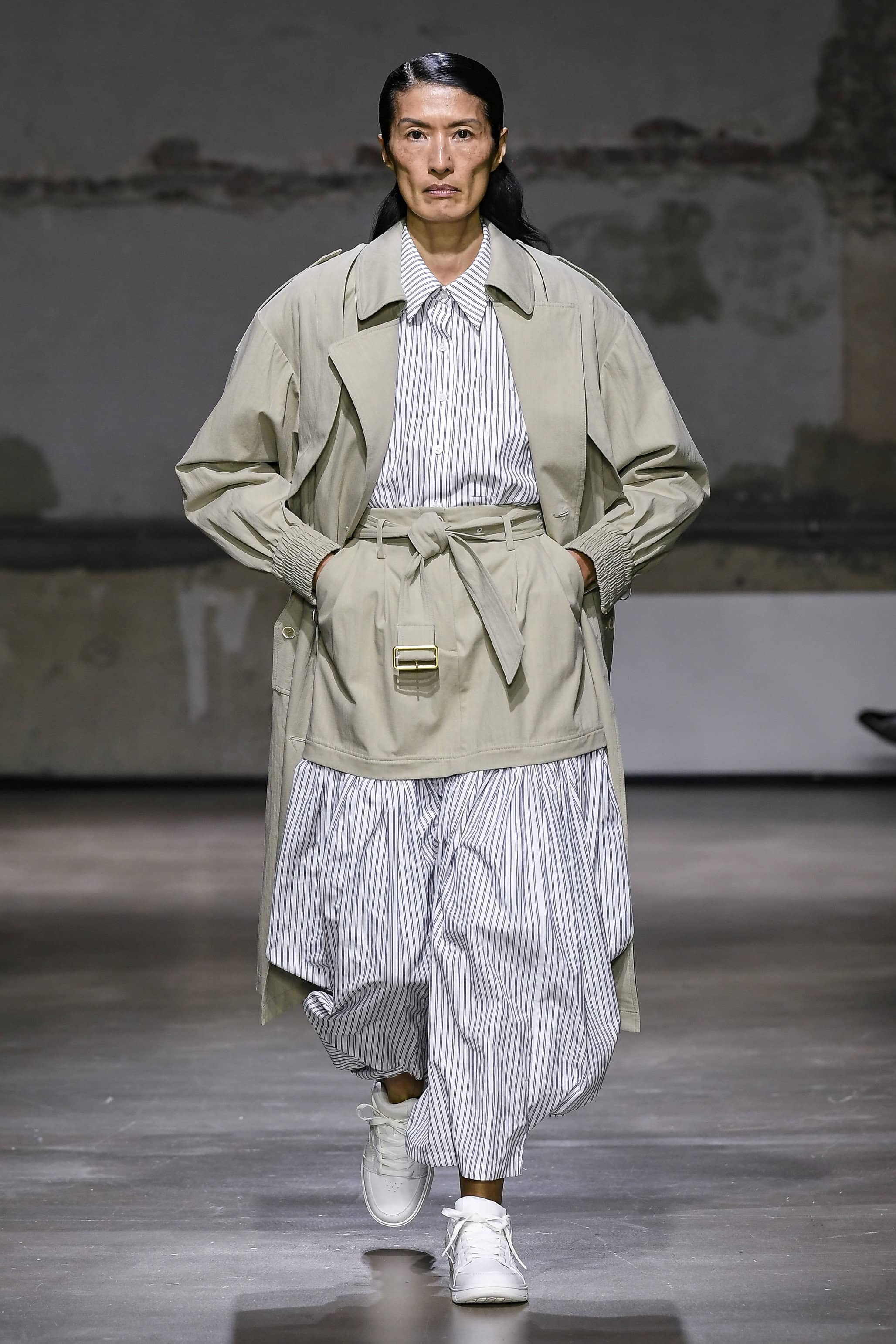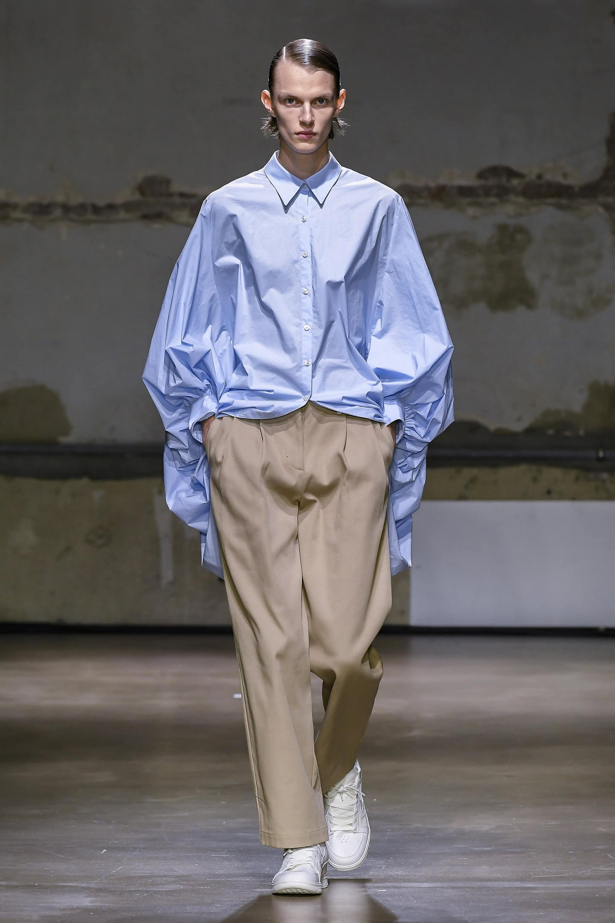 Bright but not conspicuous hues like light yellow, green-gray, light green, solar orange, bright pink, and others appeared one after the other on the runway. Grayscale was used to get rid of the extraneous elements, but it also left a strong aftertaste. The viewers could also witness large prints scattered throughout the fascinating hues. IRK learned that the almost abstract geometric patterns are actually a blurred reprocessing of concrete photographs, supposed to make the fabric look like a canvas.