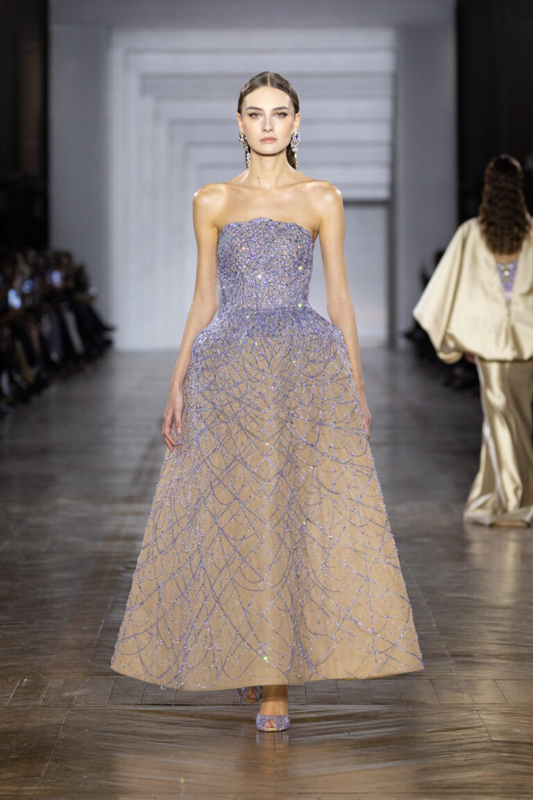 We loved to see the collection’s wide sleeves, flowing skirts, hemlines that drop at the sides of the body, geometric lines that radiate from the waist, pleats that drape from the fabric, and cocoon silhouettes that wrap the body. The Designer showed that fashion and even couture does not always have to be rigid and controlling. It may be simple, carefree, and organic while highlighting femininity and integrating it with everyday life.