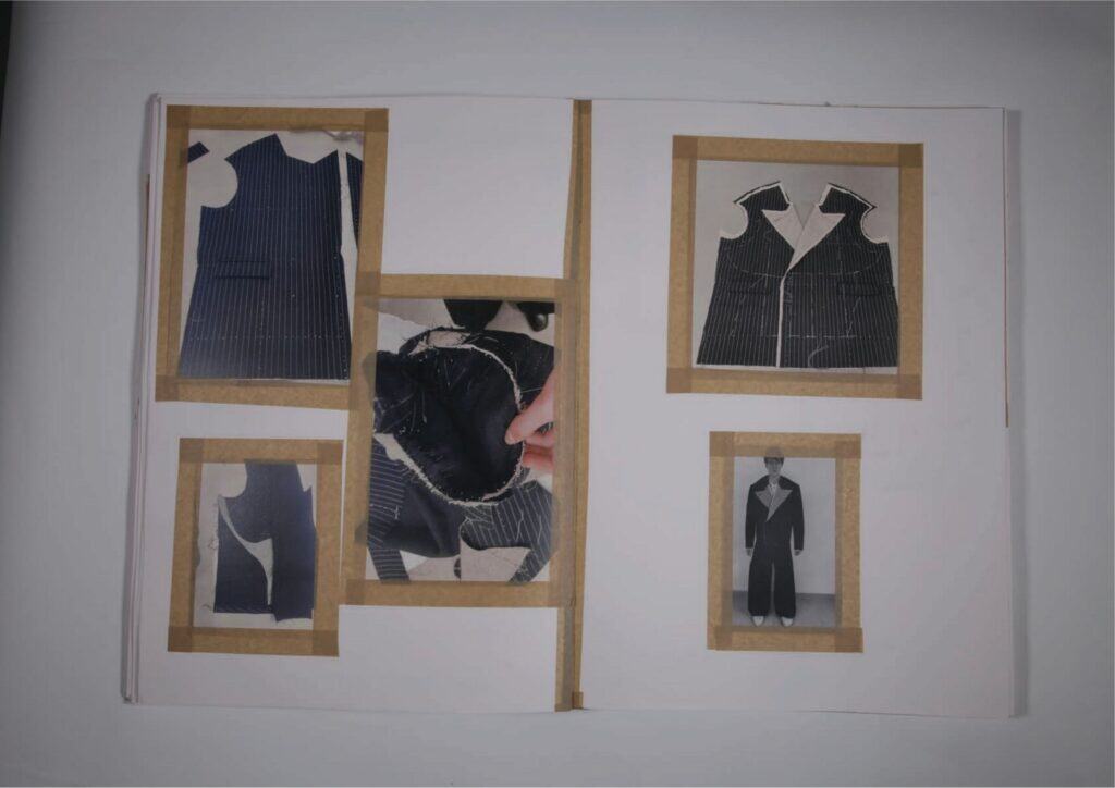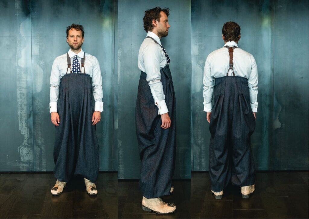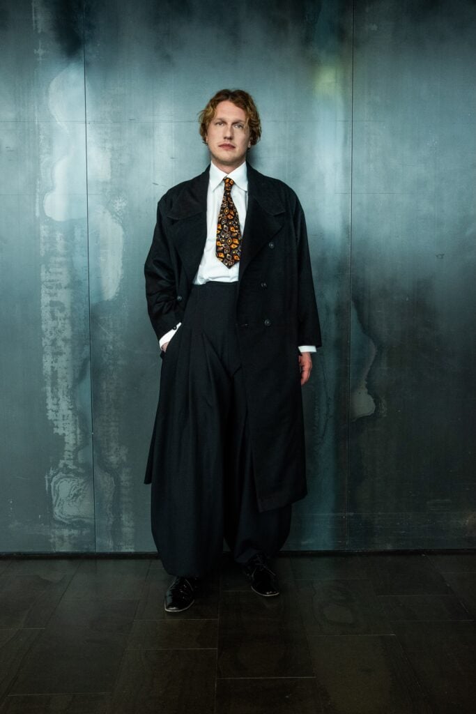 Kári always starts his process with careful observation. “I research a certain oddity, such as a cat wearing a suit, and try to understand why I find it interesting,” he says. Afterwards, he experiments with sketches, reenactments, and even dressing his roommate as a model. Over time, he gradually turns these playful ideas into tailored garments.