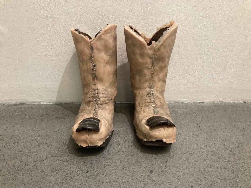These surreal, flattened figures shaped both the design and the playful feel of the shoes. “Because of that odd connection, I found the toe boots to be a perfect fit.”