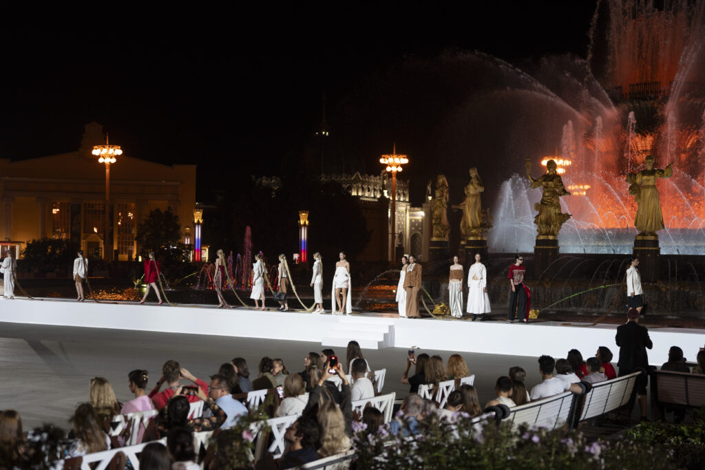 Alena Akhmadullina sliced folkloric embroidery into sharp coats with heritage urgency. Meanwhile, Alexander Arutyunov sent sculptural shoulders gliding over the river’s reflection, proving drama still captivates. Yakutia’s Inniki spun a children’s story into shimmering eveningwear. Julia Dalakian delivered draped tailoring that spoke softly but carried weight. Moreover, Ruban Couture chose Tolstoy’s House, mixing literary history with romantic suiting and polished edges.