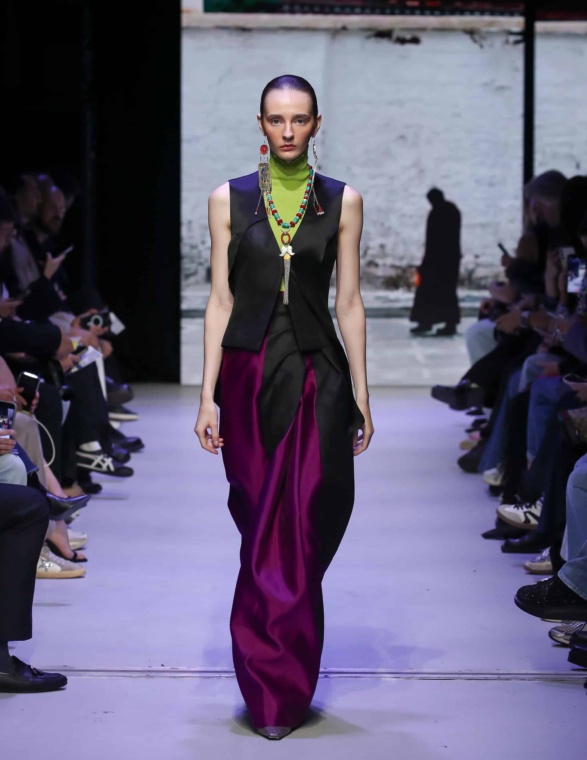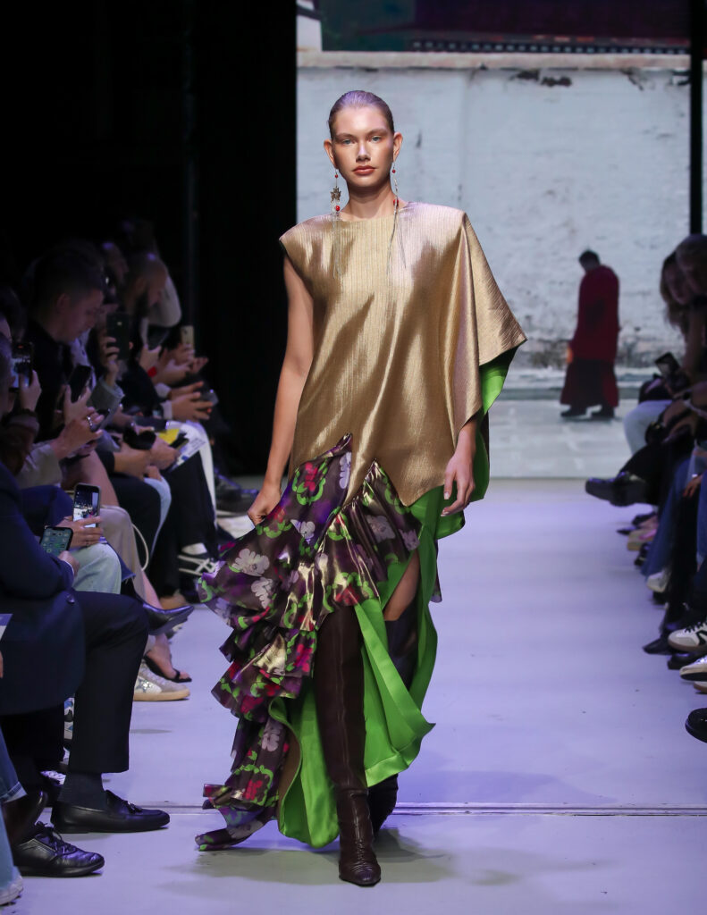 The most electric energy came from Global South Countries and their diaspora. For example, David Tlale of South Africa sent metallic brocades and a finale cape that drew gasps, grandeur as cultural statement. Similarly, Artemisi of Brazil brought molten-metal illusions and daring safety-pin details, merging avant-garde bravado with sustainability. In addition, Bibiré International (Nigerian-American) and Pia Lindsay (U.S.) paired Afro-futurist prints with eco-conscious eveningwear, proving that responsible fashion can be glamorous. Subai, led by China’s Ma Guai, wove hand-dyed Tibetan pulu wool into modern coats, a bridge between mountain traditions and city streets.