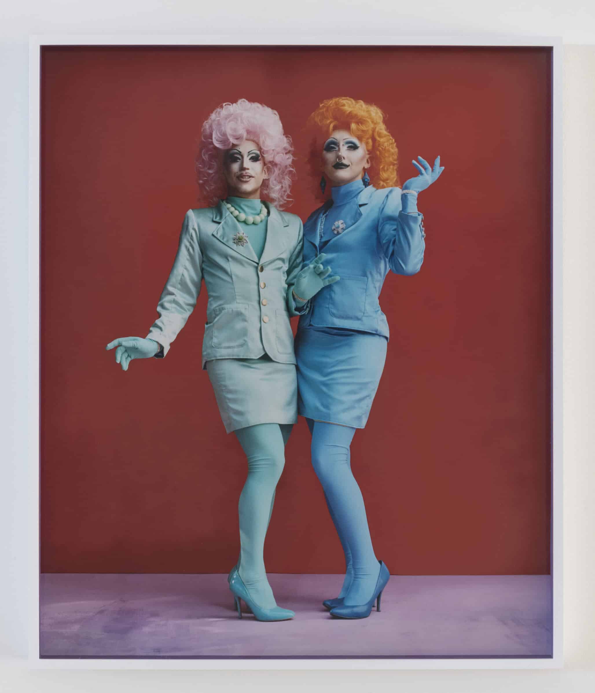 Camila Falquez’s portraits elevate drag performers to the status of mythic figures. However, she does so with an intentional wink. In “Sherry Poppins and Qhrist Almighty (She)”, two performers stand in pastel monochrome matching suits. Their bright colored wigs and exagerated makeup casts them as living monuments. The theatrical poses and saturated colors are both grand and humorous. Thus, they offer a visual metaphor for how contemporary icons are created and consumed.