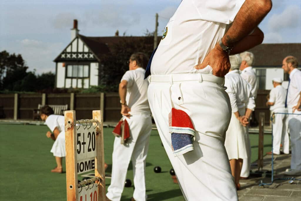 Martin Parr’s work often captures the quiet absurdity of everyday life. He does this particularly through the lens of leisure and consumption. In “THINK OF ENGLAND [Bowling, Bristol], 1995”, Parr photographs a group of lawn bowlers on a pristine green. The image focuses on a single man’s back pocket, where a Union Jack towel peeks out. This subtly adds an ironic flourish to the otherwise mundane scene.