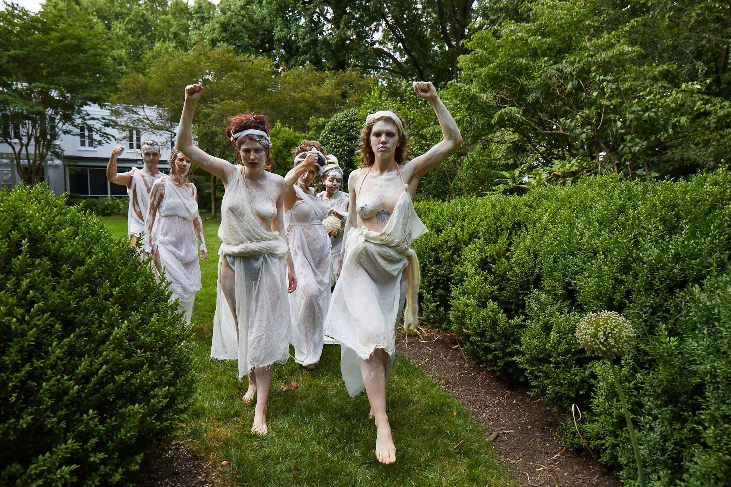 At the Center for Hellenic Studies in Washington DC, USA, she further continues a contemporary cycle and re-interpretation of Gaia and/with her living earthbound fellow counterparts. With caress and great sense for collaborative practice during her experimental performance, Iris Brosch gives women back their dignity and grandeur. Playful, shrill, loud, and with flamboyant references, opulent imagery of “ugly beauty” and wildly intertwining gesticulations merge into one body; a snake-like entity of enragement-provoking norms and laws of a culture wherein women are traded as commodities between men and rape is permissible by law.