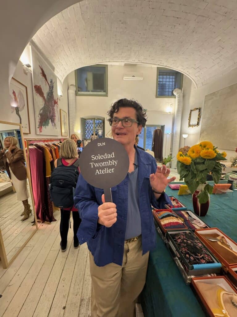 At Soledad Twombly’s L’Archivio di Monserrato, antique silks and Ottoman robes hung like fragments of history. In fact, Twombly, known for reviving ancient techniques, spoke of material as memory. As one might expect, the atmosphere felt like stepping into another century. One designer touched a woven textile and said, “This is where story becomes fabric.”