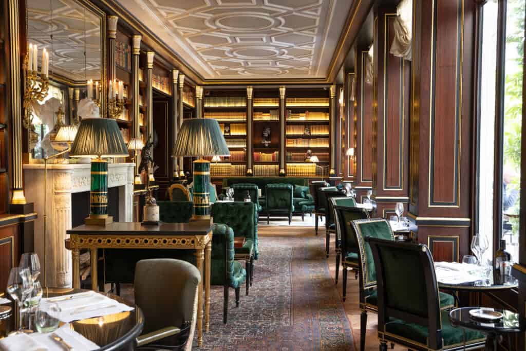 The hotel is housed in a Haussmann-style building from the early 20th century, whose architecture perfectly inspired interior designer Jacques Garcia. His vision celebrates the elegance of the period, filling spaces with light while softening it with rich fabrics and textiles. Beautiful marble fireplaces, delicate moldings, carved friezes, and engraved Cordoba leather trims on lift doors while bar counters evoke a spirit of generosity and luxury. Renovation work restored woodwork, moldings, and hidden cornices. Meanwhile, the Louis XV Salon retains elements of its original grandeur. This helps preserve the atmosphere of a bygone era.