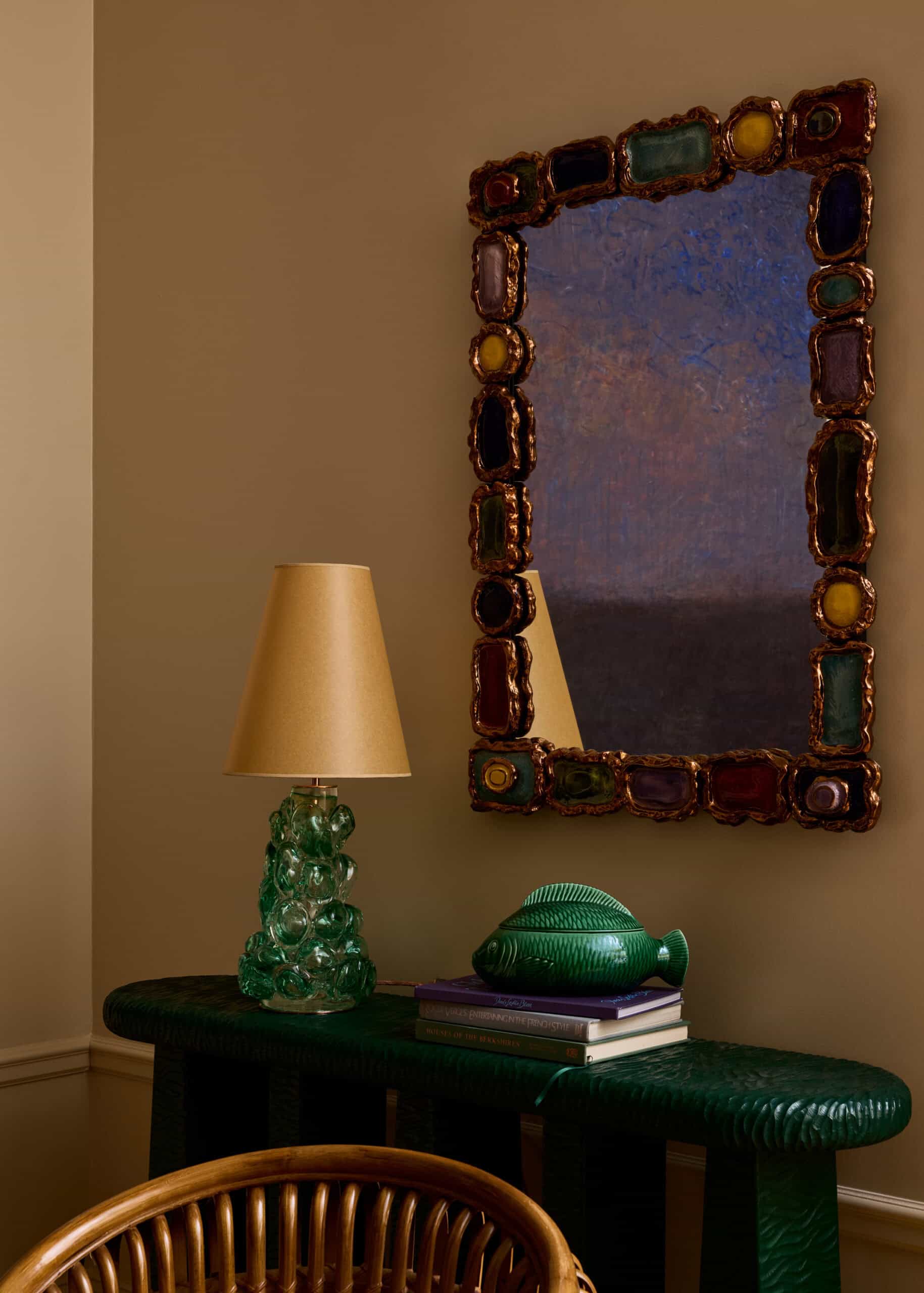 In fact, her process feels more geological than decorative. Each ceramic gem appears as if unearthed, smoothed by time, and placed with patience. As a result, the mirror becomes a topography of pigment and form, reminding us that the act of looking can be just as layered as the materials we look through.