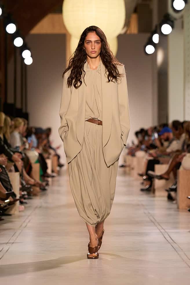 Colors told a story of nature. Branch, coffee, and ecru dominated the looks, while palomino, cashew, quartz, and guava glowed like desert sunsets. Accessories completed the vision. Oversized leather clutches and knotted totes carried texture and weight while bold leather jewelry, crafted by Italian artisans, reinforced the artisanal tone. Streamlined sandals and mules, flat or heeled, tied the collection together with effortless glamour.