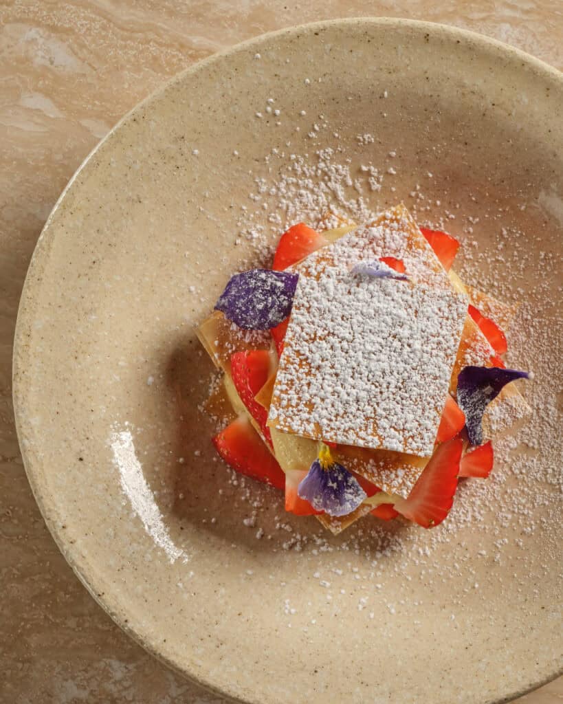 Designed by Block1: Design, in collaboration with South African designer Vernon Viljoen, Myrtos exudes a calm Mediterranean vibe, firstly. Together with circular tables are gathered around an olive tree, a symbol of peace, love, wisdom, and prosperity. Which resonates across cultures and is deeply rooted in ancient Greek mythology. Secondly, soft, moon like lighting and wave like fabric gently fluttering overhead, creat a sense of tranquility. Also the vibrant artwork by Greek artist Christos Raptis and mesmerizing glass panels from Cypriot artist Yorgos Papadopoulos bring the spirit of Myrtos beach. No detail has been overlooked. Then there is the selection of handcrafted ceramics, designed exclusively for Myrtos by Irin Lakka, beautifully complements the culinary offerings without overshadowing them. Each piece is meticulously made by hand in Lakka’s studio in Pelion, Greece. Reflecting the natural landscape with its texture, simplicity, and earthy quality.