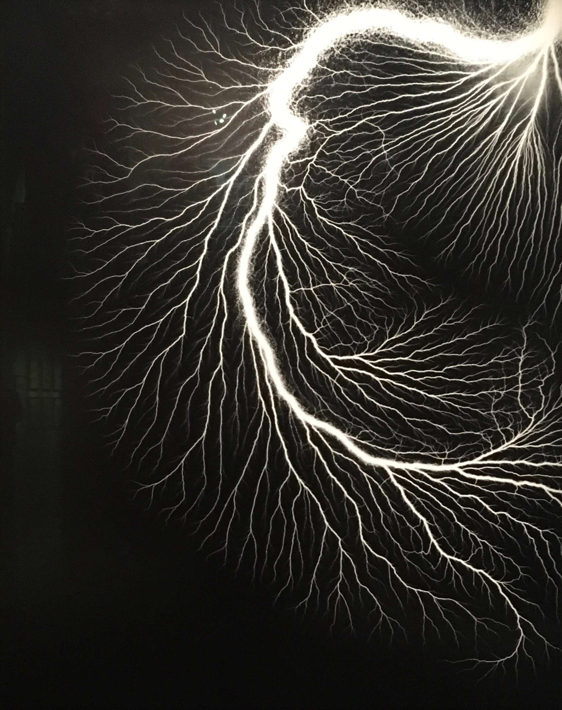 A calotype negative, dated the 13th of February 1843, entitled ‘Elm tree in winter, in the grounds of Lacock Abbey’ by Talbot, is exhibited alongside incredible gelatine silver prints by Hiroshi Sugimoto measuring 182.2. x 154.4cm, entitled ‘Talbotized 013’ in homage to the great master. In the latter half of the 1830s, at the same time that Talbot was creating the negative-positive photographic process, he also conducted electrical discharge experiments with Michael Faraday using a ‘discharge wand’ made of brass and glass.
