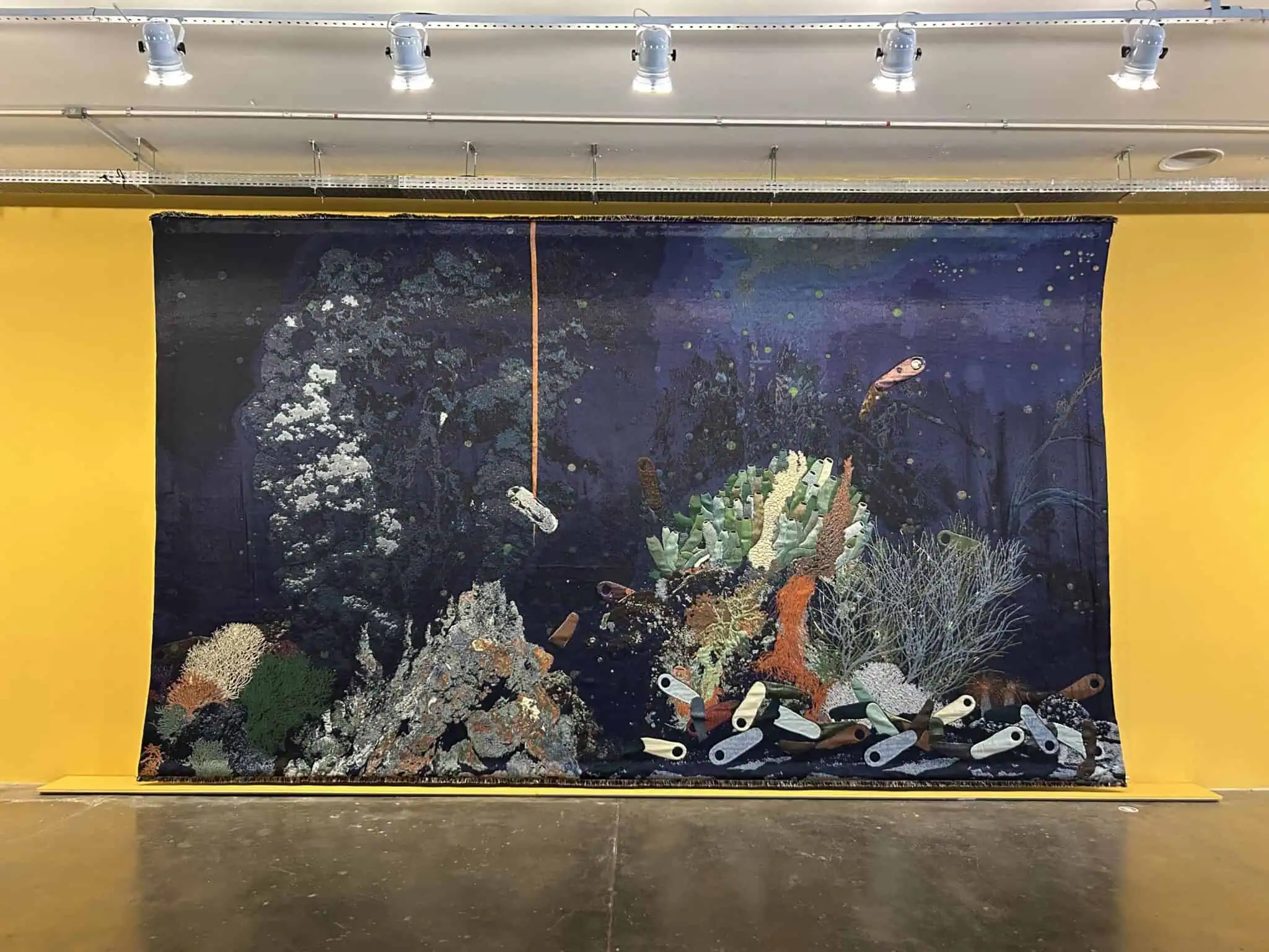 Dazzling like woven memory, the tapestry “Unearthed – Sunlight”(2021) unfolds across several floors. Its wool, viscose, mohair, and polyester threads build a stylized forest. Each color, in turn, echoes a landscape. Nkanga also reveals a visual poetry that interlaces extraction, memory, identities, and ecology. As a result, the interwoven organic forms become a sensitive metaphor for the ties between humans and the environment. Ultimately, these ties twist through the geopolitical and ecological tensions that shape us.