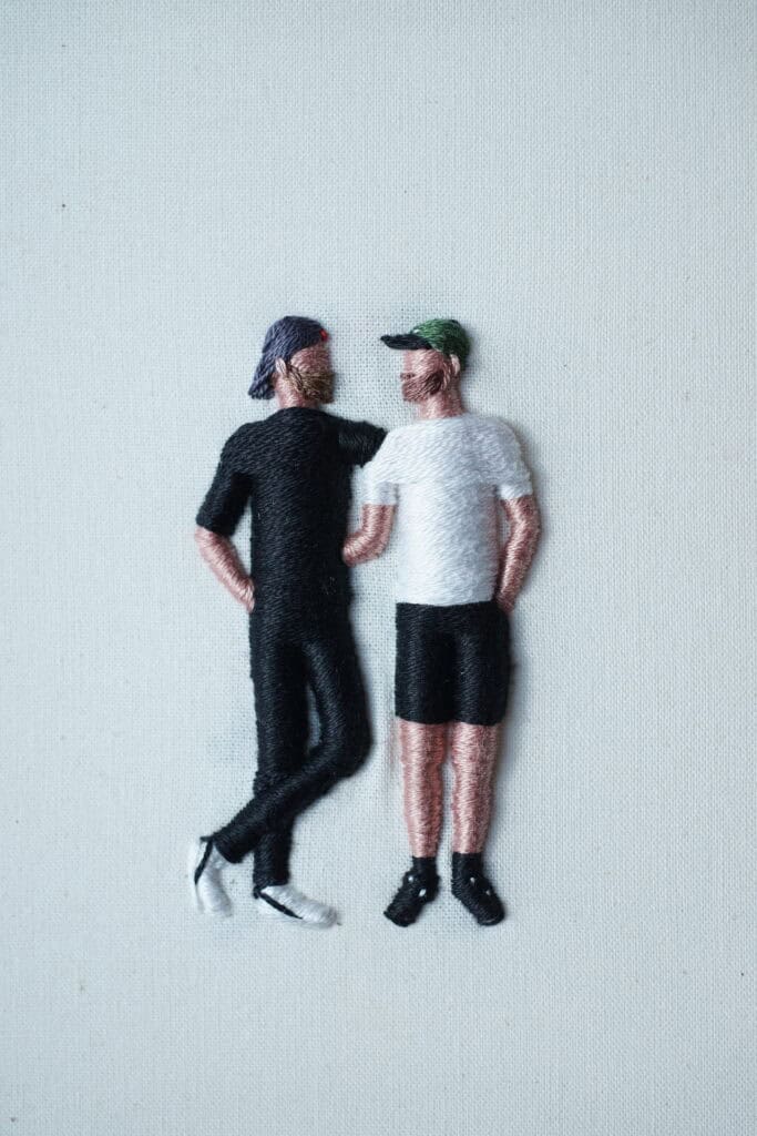 Before embroidery entered her daily life, Valentina worked primarily with installation. Lockdown stripped her of space, materials, and mobility. Therefore, she turned towards what she could hold in her hands. Armed with nothing more than fabric, thread, and a needle, she began embroidering images of what she missed most. These included people gathering freely, bodies resting together in nature, and communal joy unfolding on lawns and beaches.