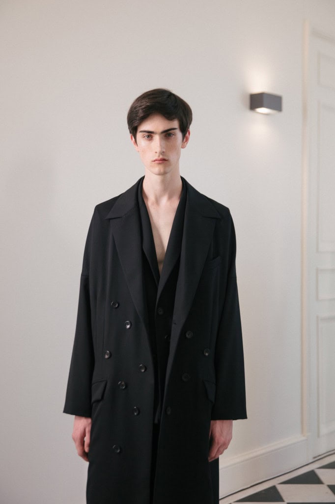The classic all black look rearranged with a touch of Sulvam. Button downed coat with buttons all over the front. It is paired with black trousers and shiny black shoes, and no accessories to remain simple and clean. His collection felt like a breathe of fresh air into simplicity. Yet it remained true to the codes of Sulvam by emphasizing minimalist elegance.