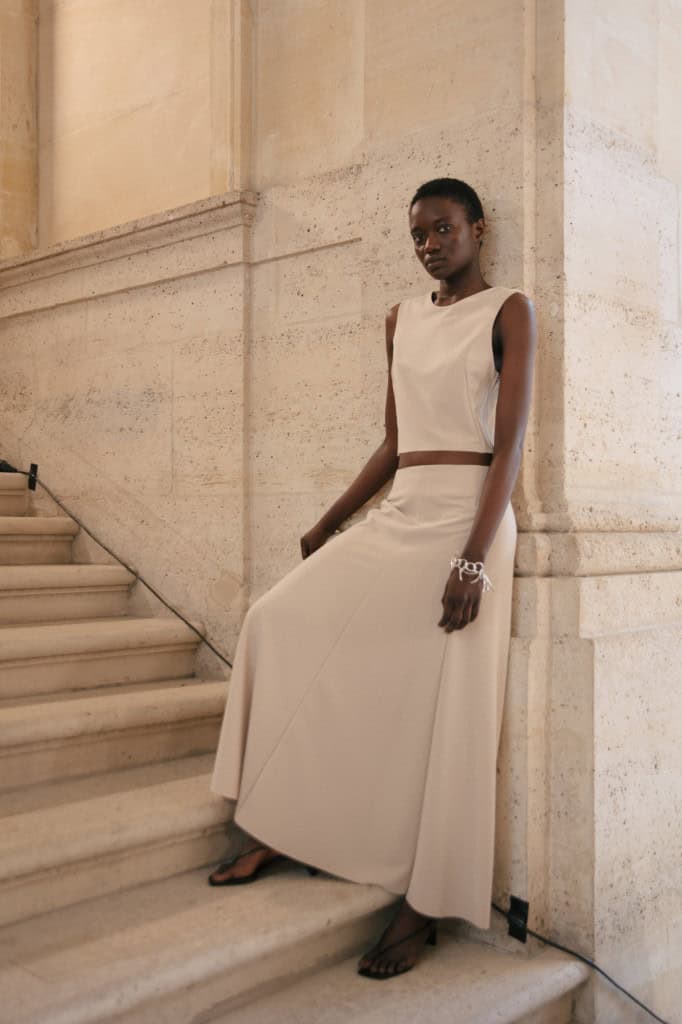 Not only did the collection encircle simplicity, the location of the presentation at Musée des Arts Décoratifs was satisfyingly calm. The models were spread out giving one free space to admire the designs. There was no music but just the sound of footsteps walking in a large room repeating. The Color palette of the garments reflected the ambience of beige, black and white marble. Truly, it embodied Sulvam’s tranquil sophistication.