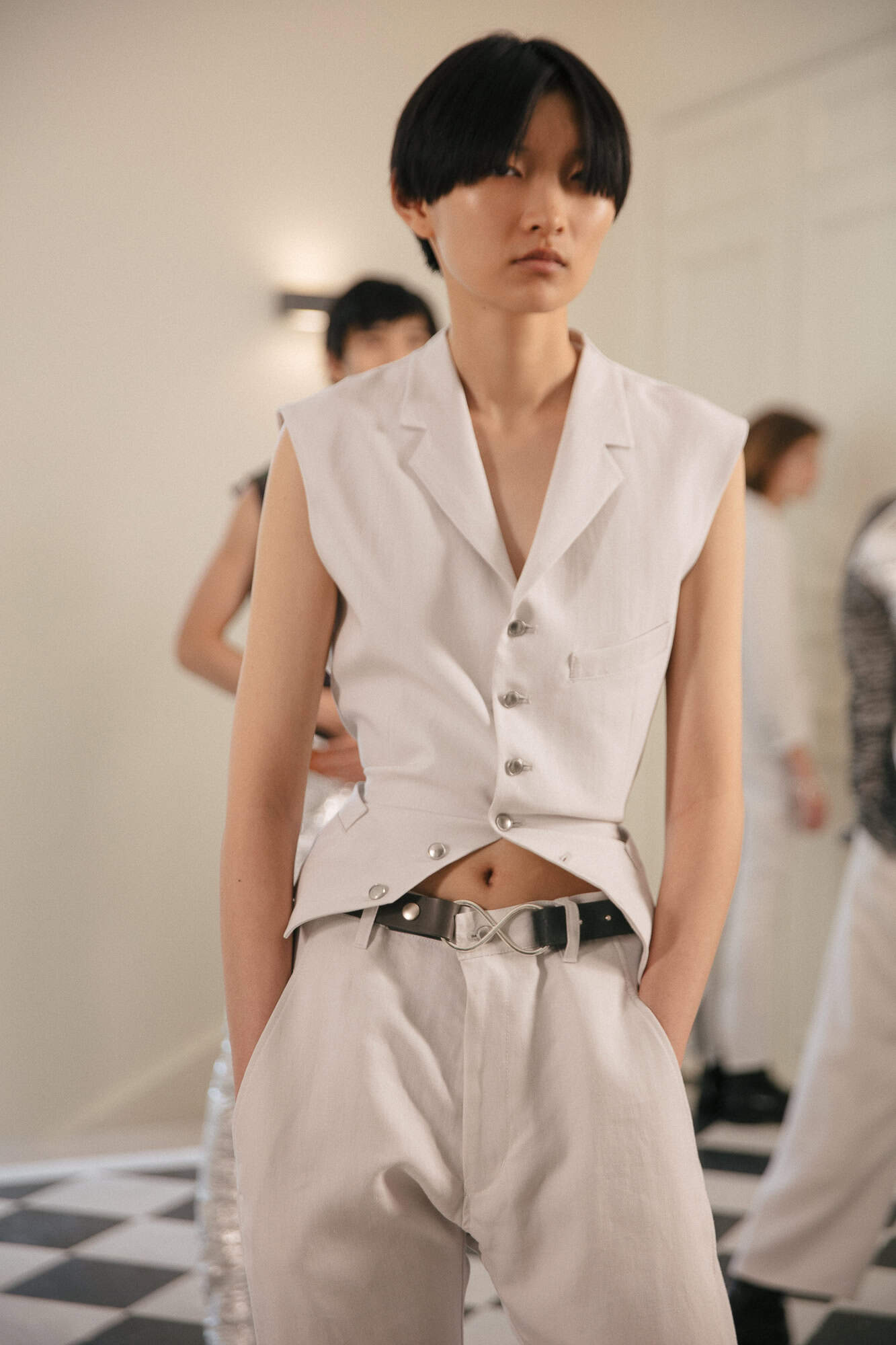 Models also proved another house code of the Sulvam brand as they seemed that they could either be female or male. They demonstrated looks that can be interchangeable such as the all white suits, gray sweater and trousers. Or a black over sized blouse and T-shirt with beige thread hanging off the front, perfectly illustrating the versatility of Sulvam.