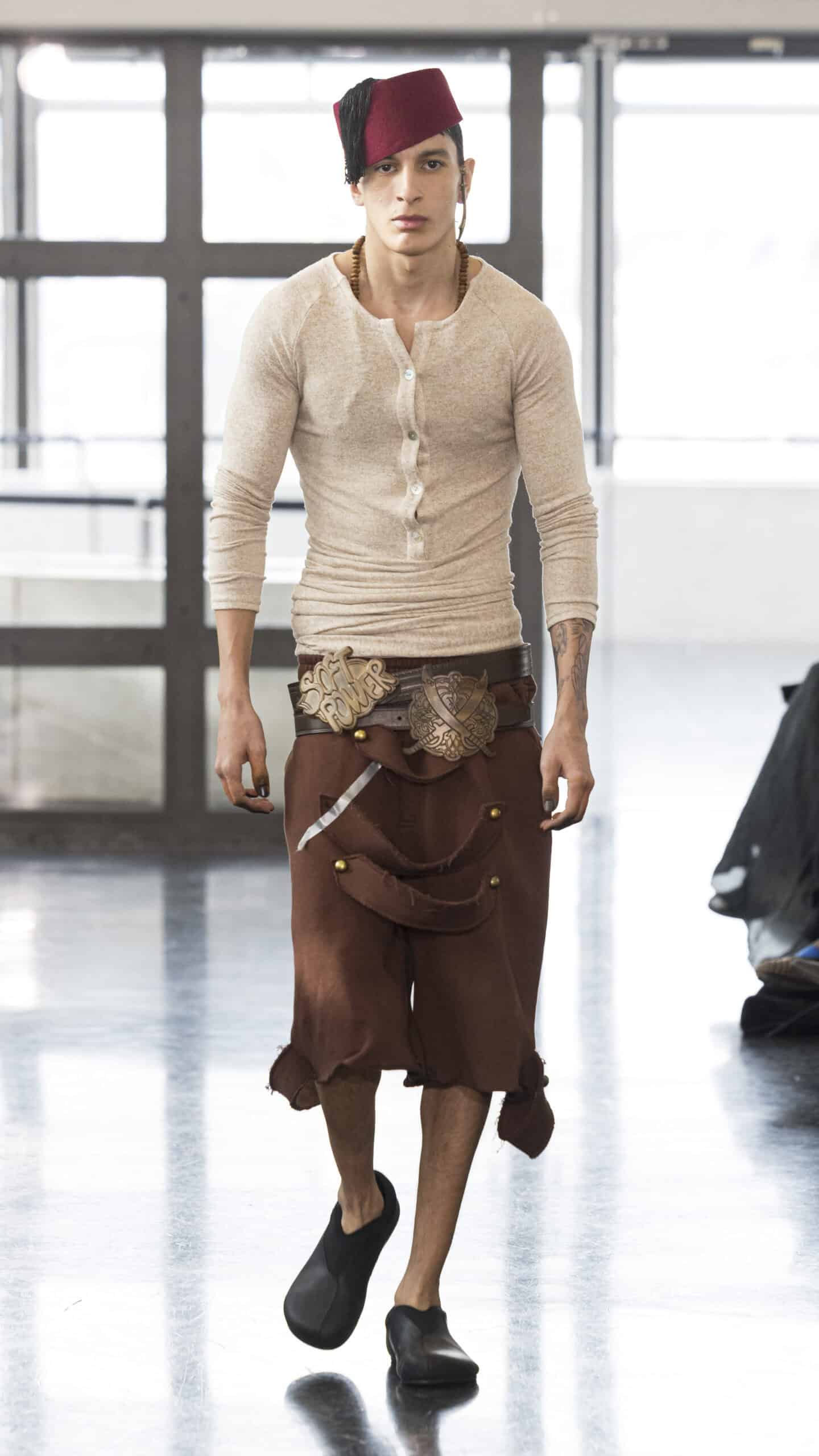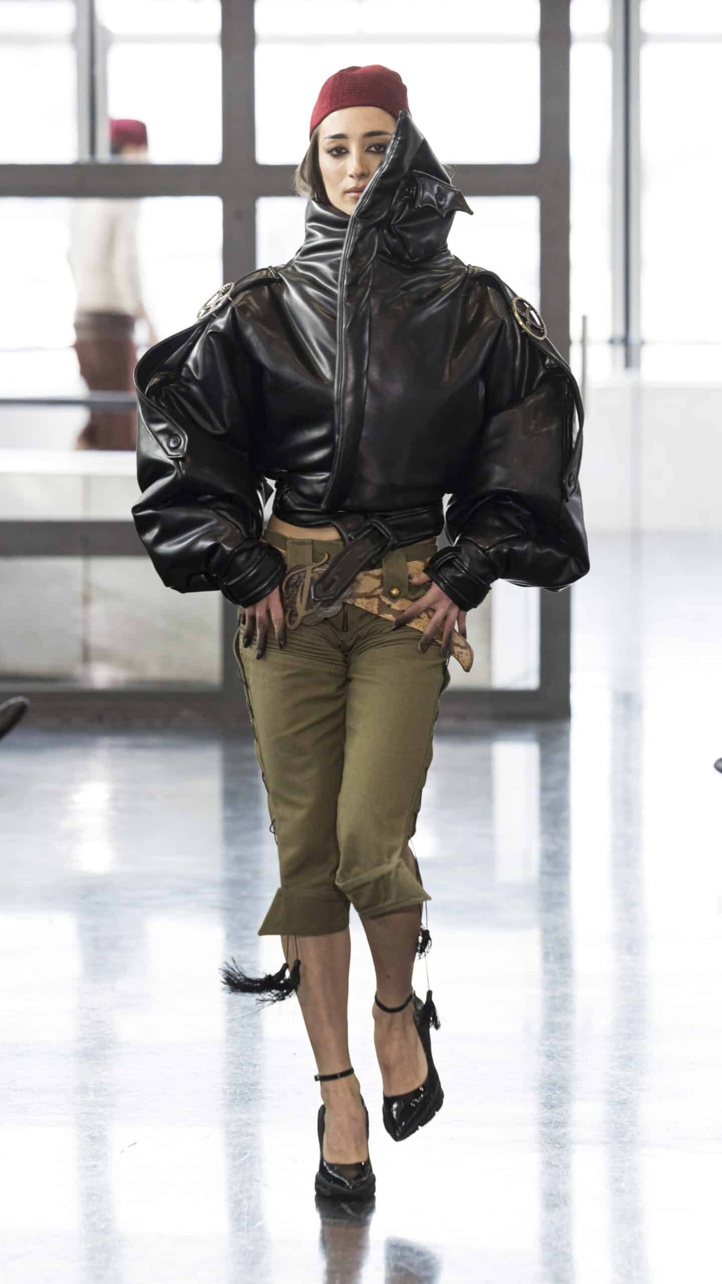 Everyday rituals unfold alongside systems of control. Consequently, through precise tailoring and measured silhouettes, the pieces evoke a sense of stillness and restraint. The collection channels the quiet spectacle of power portrayed in Elia Suleiman’s film Divine Intervention. There is also a collaboration with Sheytan, whose sword-inspired jewelry appears throughout the collection as both structure and a way of symbolic protection. One distinctive element of the “In Divine Trust” Collection is its collaboration with Trashy Clothing. This elevates the brand’s innovative identity. Moreover, the “In Divine Trust” lineup brings new meaning to Trashy Clothing. It merges artistic expression with bold visual narratives.