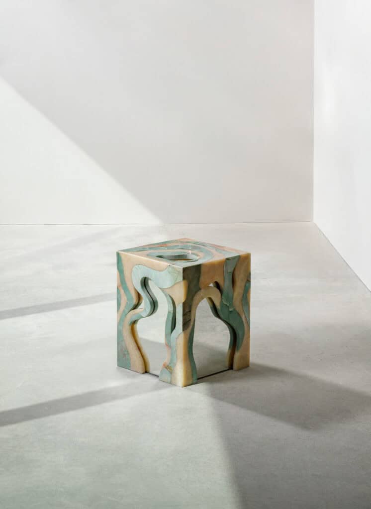 Tuğba Koç is an artist and designer whose work centres on transformation through material. She immerses herself in the properties of glass, marble, brass, and copper. A defining element of her work is her experimental approach to mirroring, where elemental reactions give rise to unexpected patinas, patterns, and reflective surfaces.