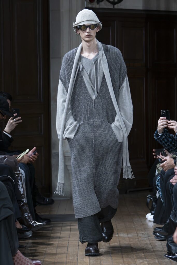Presented at the Église Protestante during Paris Men’s Fashion Week, the show unfolded in an atmosphere of quiet focus. Lighting highlighted soft greys, earthy browns, and muted yellow tones. Meanwhile, Alessandro Tinelli’s music and visuals reinforced the restrained mood.